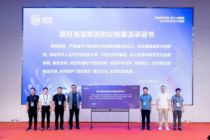 隨后,在集團(tuán)副總裁李振廣詳盡地為大家解讀供應(yīng)商管理和質(zhì)量管理體系的相關(guān)內(nèi)容后,7家戰(zhàn)略供應(yīng)商代表上臺(tái)簽訂《青島明月海藻集團(tuán)供應(yīng)商廉潔承諾書(shū)》。