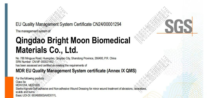 近日,青島明月生物醫(yī)用材料有限公司的代表產(chǎn)品“藻酸鹽無(wú)菌傷口敷料”獲得通標(biāo)標(biāo)準(zhǔn)技術(shù)服務(wù)有限公司(以下簡(jiǎn)稱“SGS”)簽發(fā)的歐盟MDR證書,這是醫(yī)用材料獲得的第一張歐盟MDR證書,也是SGS在藻酸鹽敷料領(lǐng)域頒發(fā)的第一張無(wú)源ⅡA類醫(yī)療器械MDR證書。