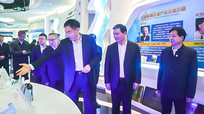 在參觀中,張國(guó)防向一行人詳盡介紹了明月海藻“海洋十年”國(guó)際合作中心的有關(guān)情況,并展示了企業(yè)深耕一棵海藻,專注海藻活性物質(zhì)高值化開(kāi)發(fā)和應(yīng)用,為海洋強(qiáng)國(guó)與健康中國(guó)方面的所作出的努力與成果。