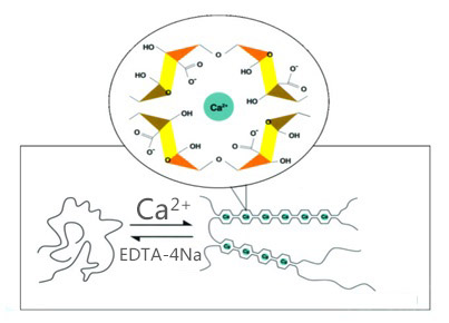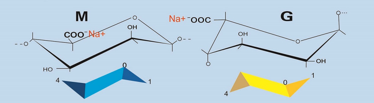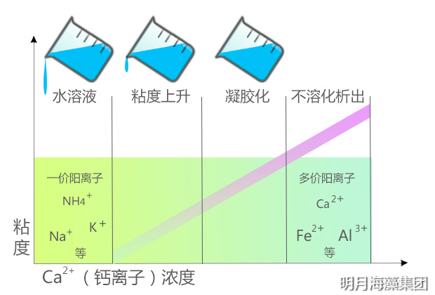 海藻酸鹽遇到鈣離子可迅速發(fā)生離子交換,生成凝膠,其凝膠具有熱不可逆性。高G型海藻酸鹽生成的凝膠硬度大但易碎;高M型海藻酸鹽生成的凝膠則相反,柔韌性好但硬度小。調整兩種比例可生產不同強度的凝膠。利用凝膠特性,可用于制作各種仿生食品、用材料、面膜、廢水處理劑、保鮮膜等。